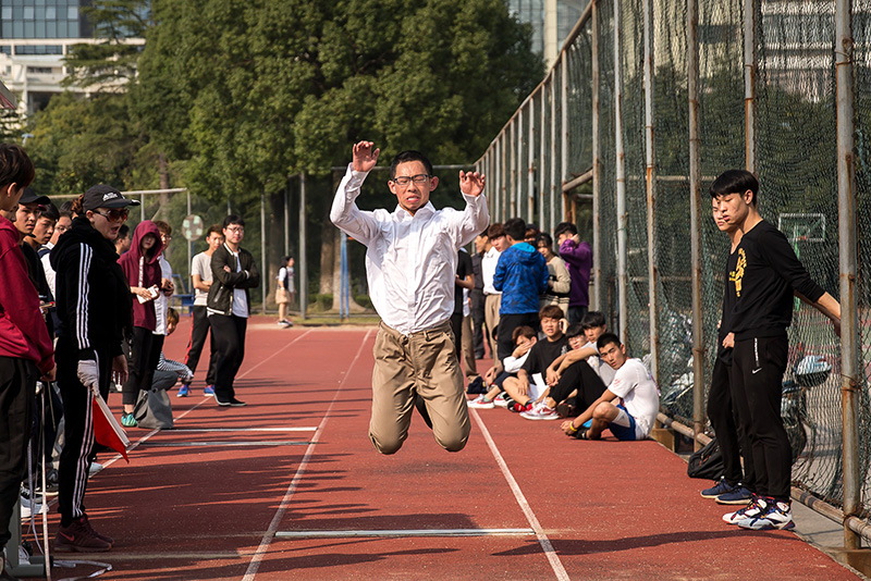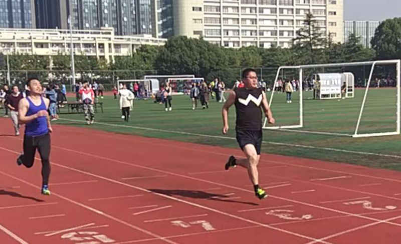 教工队比赛也紧张激烈,表现不俗。武装部副部长薛正豪老师第八次在教工组男子100米项目中夺冠。