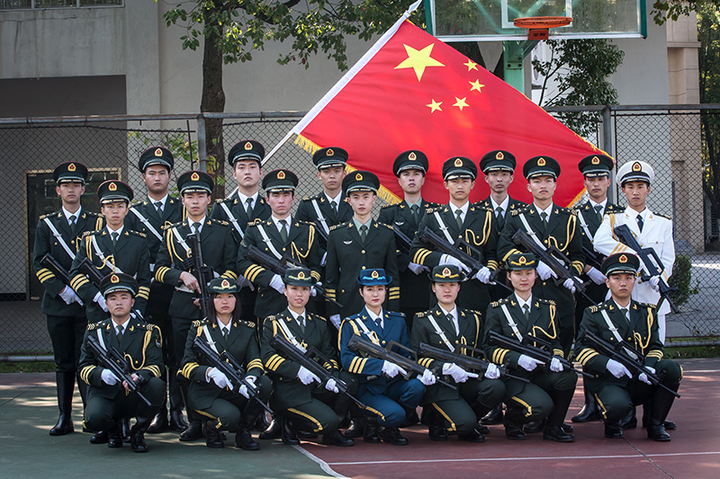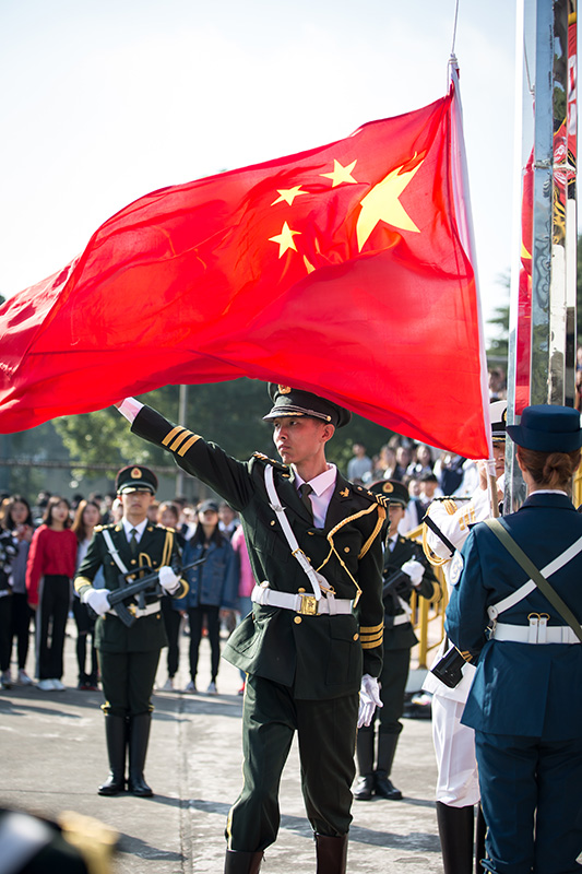 伴随着雄壮国歌声奏响,国旗队列队进行庄严的升国旗仪式。