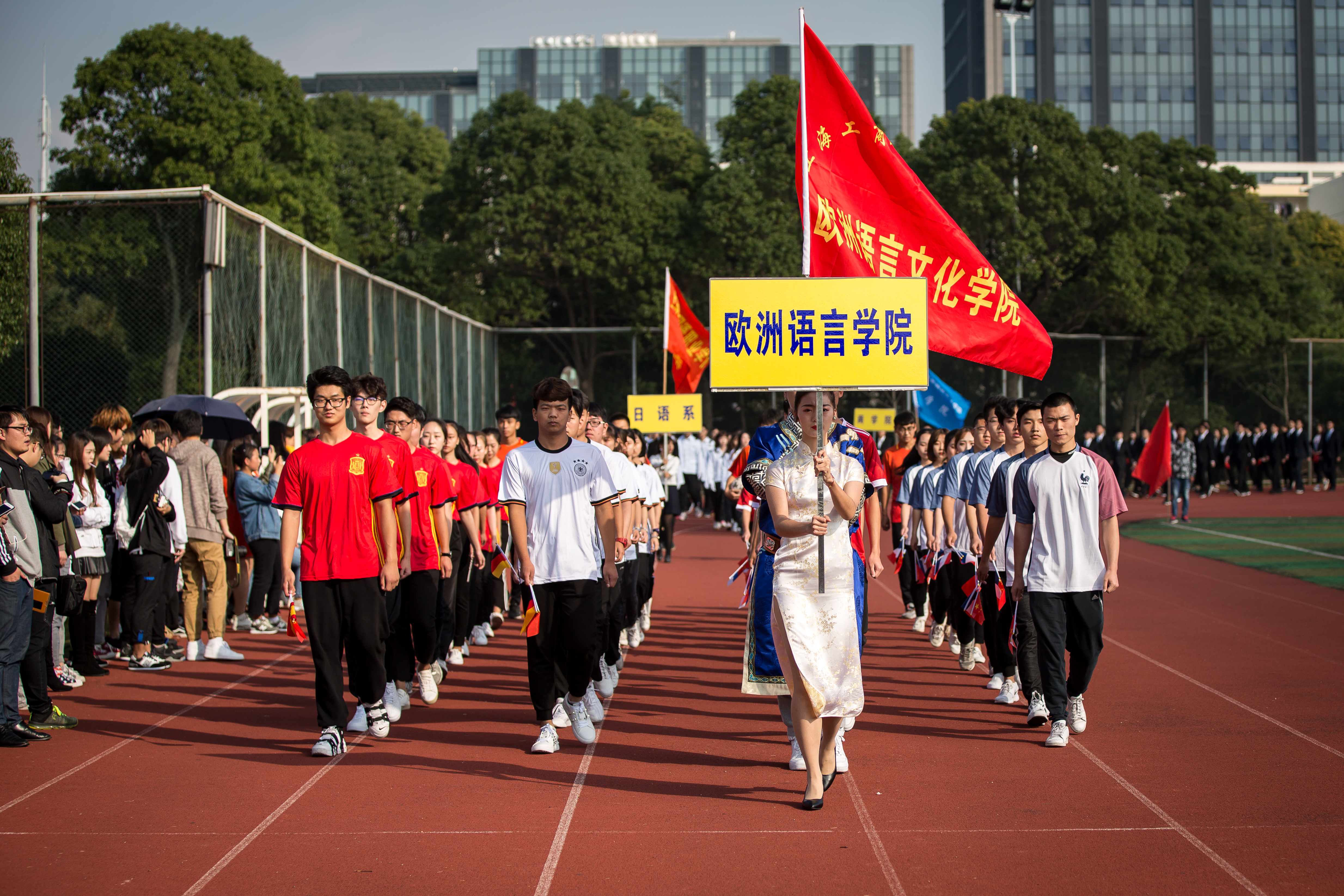 伴随着运动员进行曲,我校国旗方队首先入场,步伐铿锵、身姿矫健,展现了退伍学生的风采。我校附中方队紧随其后,青春活力、朝气蓬勃。全校各院系组成的方阵队依次入场,身着独具各自院系特色的服装、踏着坚定的步伐、高呼嘹亮的口号,展示了对运动精神的理解,给人留下了美的享受和精神的鼓舞。