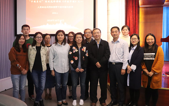 10月18日下午,我校“中国系列”课程《开放中国》在400人报告厅再次开课,浦东干部学院原副院长姜海山应邀为英语语言文化学院2018级部分新生主讲了第一课——《人类命运共同体视野下的中国与世界》。校党委副书记、副校长段仁启、思政教学部主任沈李,以及形势与政策教研室全体任课教师到场聆听。